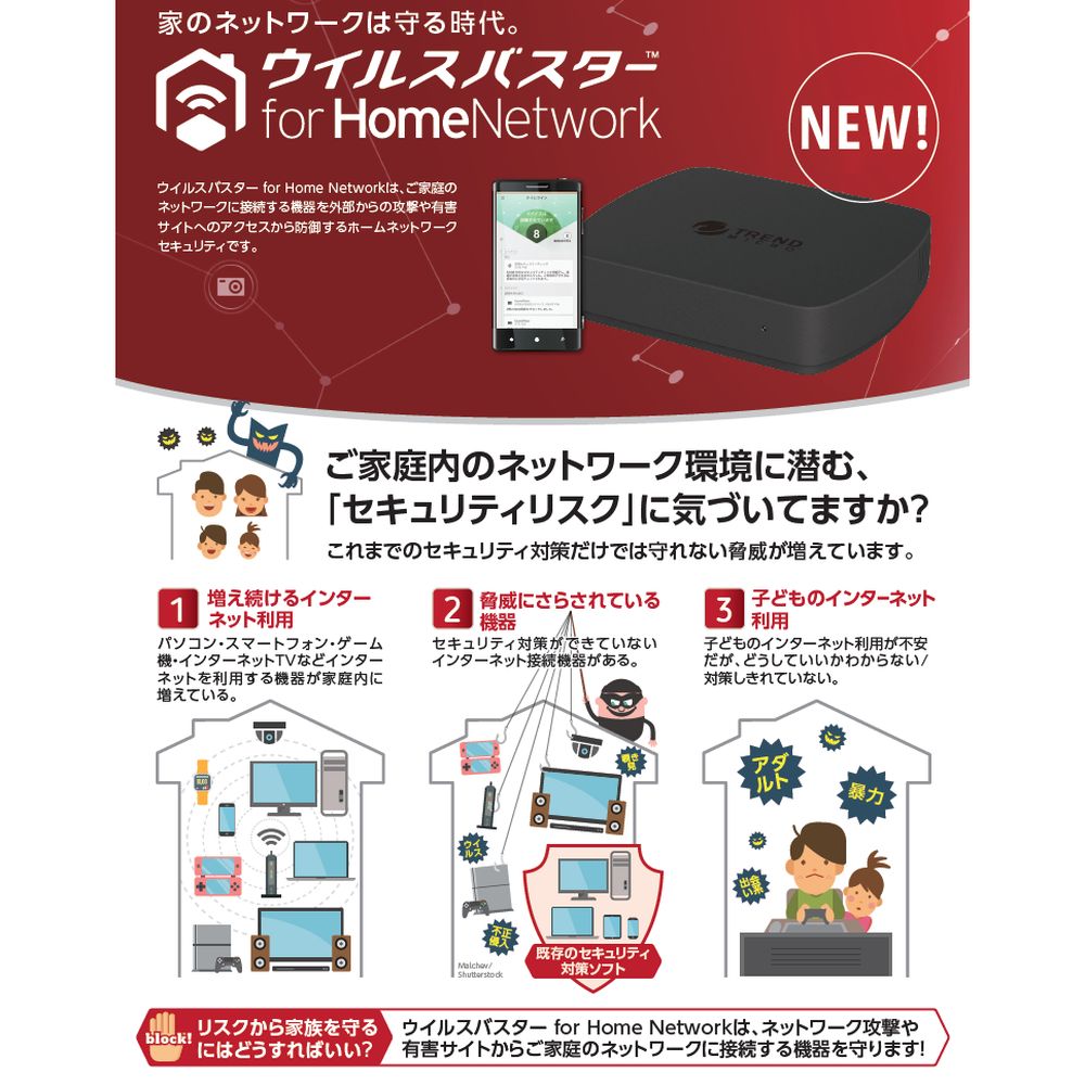ご家庭のネットワークに接続する機器を外部からの攻撃や有害サイトへのアクセスから防御するホームネットワークセキュリティです。