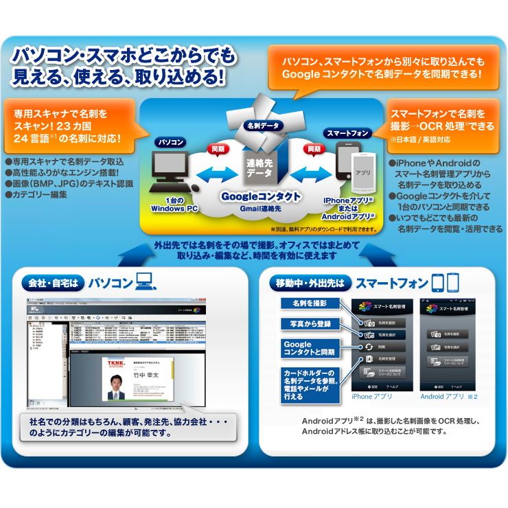 名刺をスキャンしてデータベース化、スマートフォンから取り込んでも同期OK!ATOKの高度な日本語処理技術を結集した“KOTA[コータ]”でふりがな生成も可能な名刺管理ソフトです。パソコンでもスマートフォンでも、名刺データの取り込みや閲覧ができます。パソコン、スマートフォンから別々に取り込んだ名刺データでも、Gmail連絡先(Googleコンタクト)を介して同期できるので、常に最新の名刺データを閲覧・活用できます。