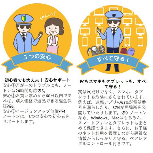 | 対応OS | Windows システム要件:Microsoft Windows XP(すべての 32 ビットバージョン)Service Pack 3(SP 3)以降、Microsoft Windows Vista(すべてのバージョン)Service Pack 1(SP 1)以降、Microsoft Windows 7(すべてのバージョン)Service Pack 1(SP 1)以降、Microsoft Windows 8/8.1(すべてのバージョン)。一部の保護機能は、Windows 8 のスタート画面から起動するブラウザではご利用いただけません。Microsoft Windows 10(すべてのバージョン)。Edge ブラウザには対応していません。。Mac製品システム要件:Mac OS X の最新バージョンと前の 2 つのバージョン。ノートン ファミリーおよびノートン ファミリープレミアの機能はご利用いただけません。。モバイル製品システム要件:Android 4.0.3 以降。Google Play アプリがインストールされている必要があります。ノートン ファミリープレミアの Android 版アプリをご利用いただくには、Android 4 以降が必要です。iOS 8 以降。 ノートン ファミリーおよびノートン ファミリープレミアの機能はご利用いただけません。