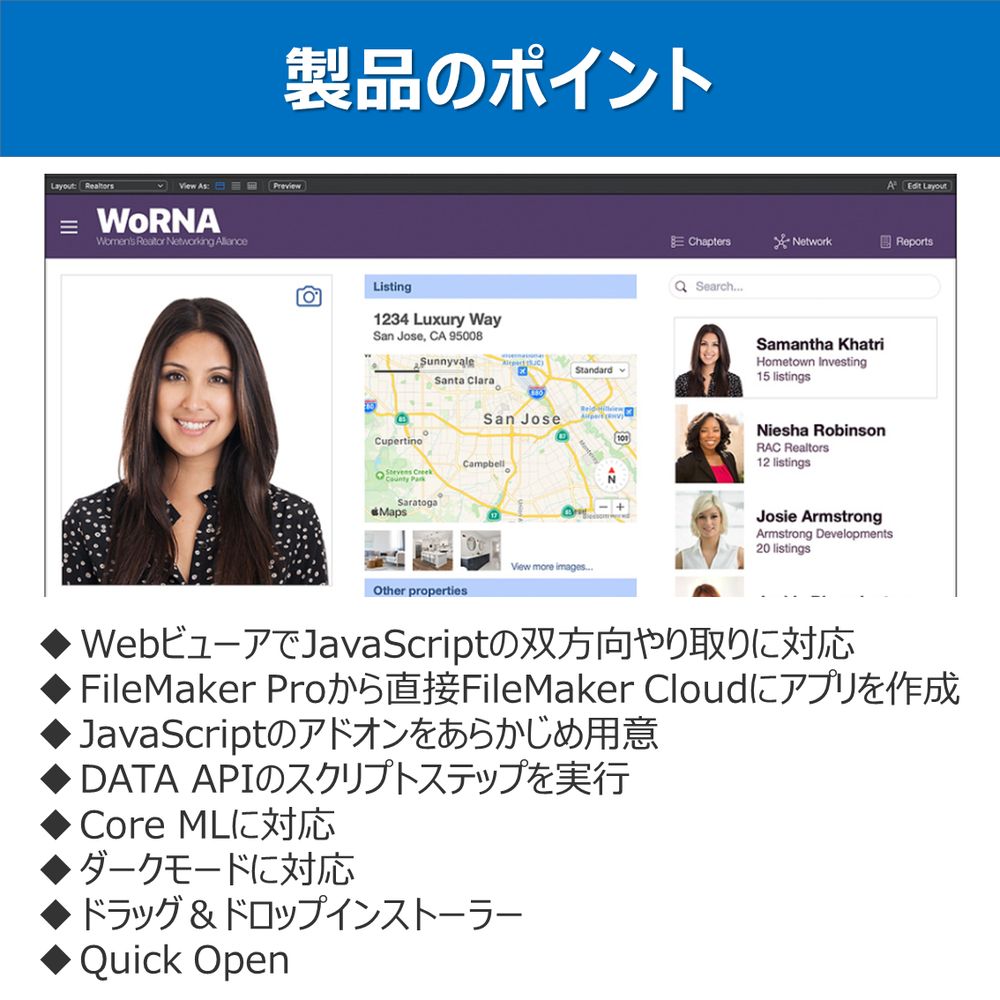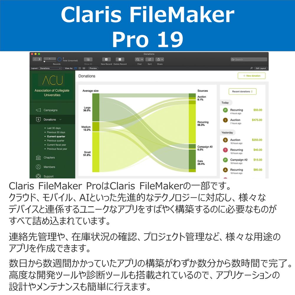 Claris FileMaker ProはClaris FileMakerの一部です。クラウド、モバイル、AIといった先進的なテクノロジーに対応し様々なデバイスと連係するユニークなアプリをすばやく構築するのに必要なものがすべて詰め込まれています。連絡先管理や、在庫状況の確認、プロジェクト管理など、様々な用途のアプリを作成できます。数日から数週間かかっていたアプリの構築が、わずか数分から数時間で完了。高度な開発ツールや診断ツールも搭載されているので、アプリケーションの設計やメンテナンスも簡単に行えます。