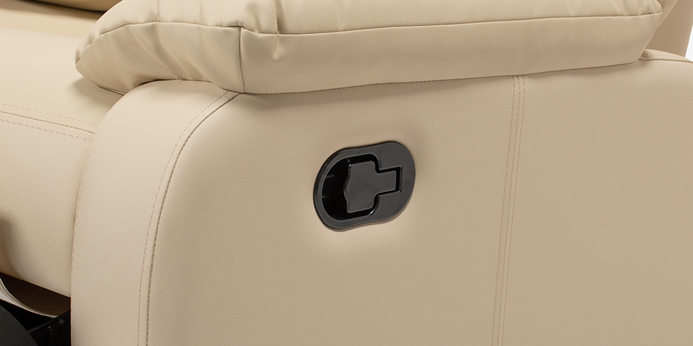 ソファの左右にそれぞれついている操作レバーで簡単に操作することができます。フットレスト(足のせ)を出すだけのシンプルな構造です。合成皮革の中でもやわらかな肌触りのソフトレザーを使用しています。本革と比べ水分に強くお手入れしやすい素材です。
