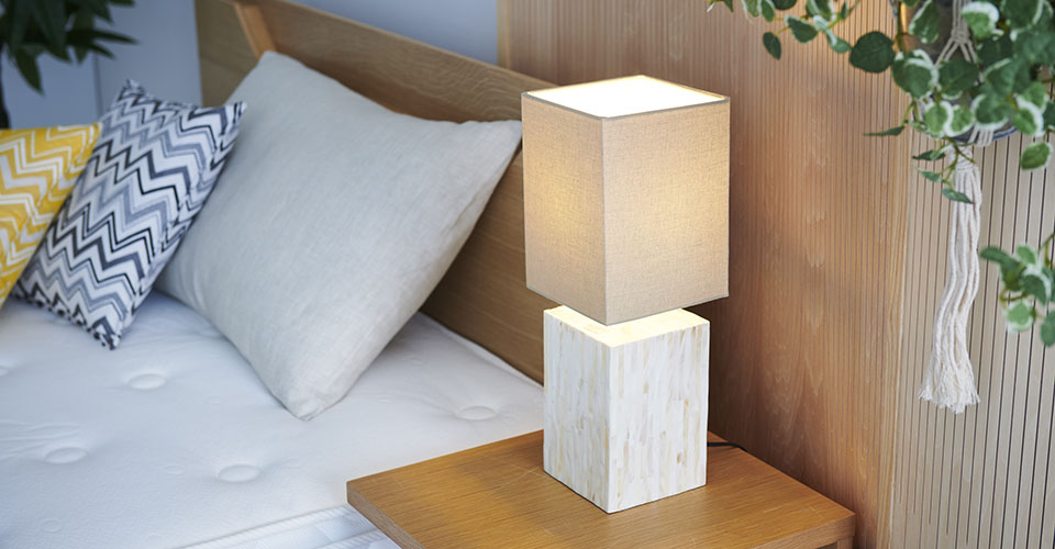 ベース部分のパールシェルが特徴のテーブルスタンド。天然素材ならではの色合いが光源に照らされ美しく浮かび上がります。置き場所を選ばないコンパクトサイズなので、ベッドサイドやソファサイド、玄関などの限られたスペースにも置きやすく、布セードからこぼれる光が空間をあたたかく照らします。