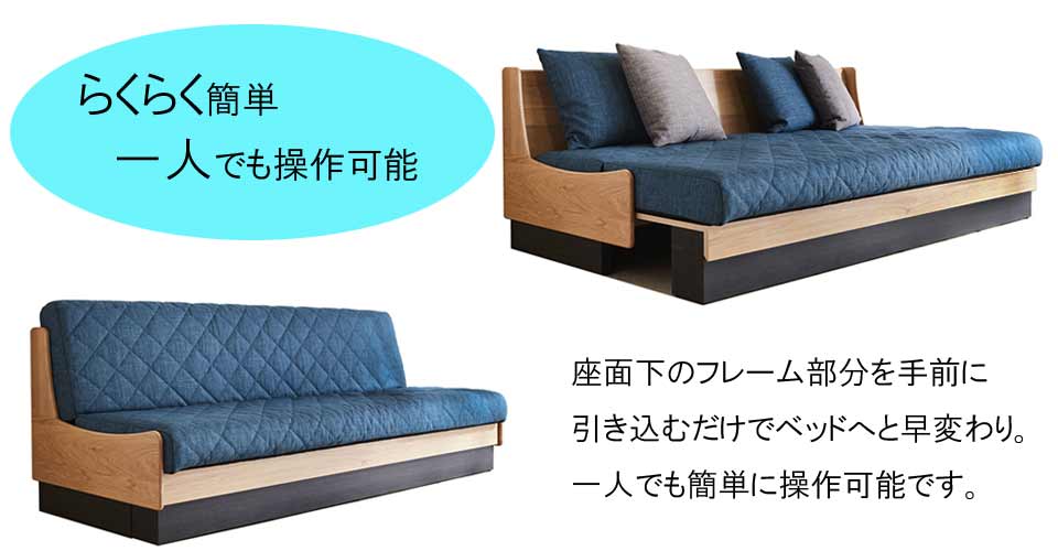 座面下のフレーム部分を手前に引き込むだけで簡単にベッドへと変えることができます。