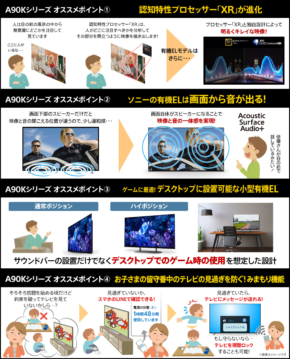 認知特性プロセッサー「XR」により、有機ELパネル特性と入力された映像信号を横断的に分析・処理し、さらにパネル表面の温度分布を検知する温度センサーと高輝度有機ELパネルを組み合わせた独自構造とすることで、緻密に温度予測し発光制御を行っています。