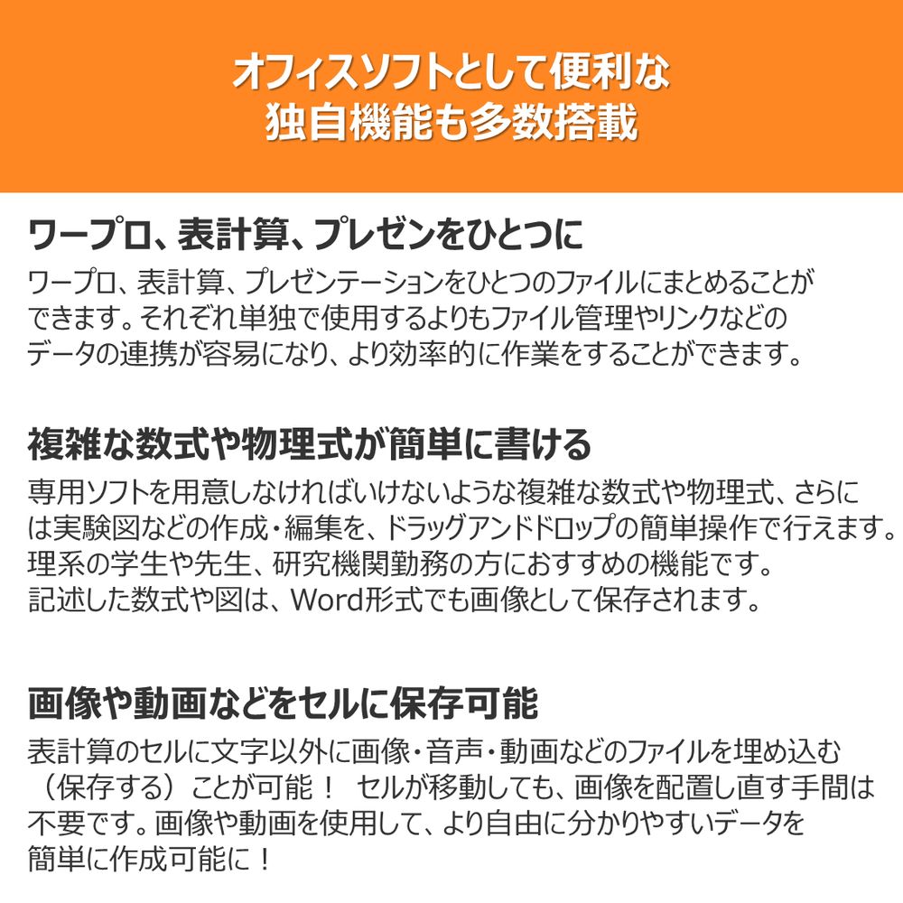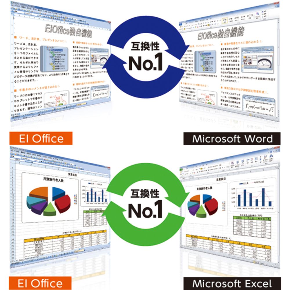 Microsoft Office と最高レベルの互換性を実現しているオフィススイートがWindows 10に対応して再登場。Word、Excel、PowerPointの文書作成と編集が思いのままです。EIOfficeは、PCではなくUSBメモリへインストールすることも可能。USBメモリから直接起動することができ、動作環境を満たしたWindows PCさえあればすぐに使用できます。EIOfficeはパッケージをひとつご購入いただければ、2台のPCにインストールしてご使用いただけます。