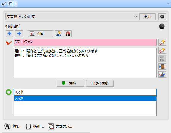 ●論文やレポートで使われる略称(以下、「○○」という。)の整合性をチェック論文やレポート、リリース文書や法律文書などでは、(以下、「○○」という。)のような略称を使うことがあります。このとき、略称を定義したにもかかわらず一度も使わなかったり、略称を用いずに正式名称を使用したりするなど、整合性がとれないときにチェックできます。
