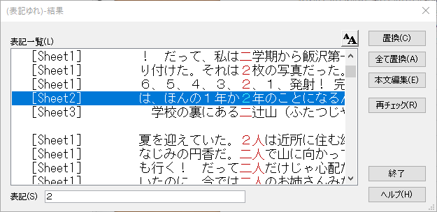 ●シートをまたいで表記ゆれをチェック表記ゆれのチェックは、シートをまたいで行えます。校正作業の効率と精度をさらに高めることができます。また、表記揺れのほか、括弧、文頭文末チェックの一覧画面では、文字サイズを3段階で調整できるようになりました。