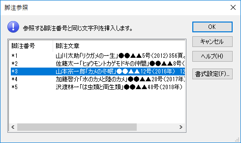 ●脚注の中でも脚注番号を自動振り直し論文やレポート、解説書などを作る際、参考文献や引用を脚注で示すことがあります。同じ文献や引用をくり返す場合「前掲注」などとして示しますが、一太郎2019では脚注参照ができるようになりました。参照元の脚注の番号が変わっても自動で番号が変わりますので、修正の手間がなくミスを回避します。