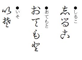 ●変体仮名変体仮名は、字形の違うひらがなで、現在でも、地名、人名、看板、書道の書体などで見かけます。IPAmj明朝フォントの搭載により、この変体仮名も文字として扱うことができるようになりました。