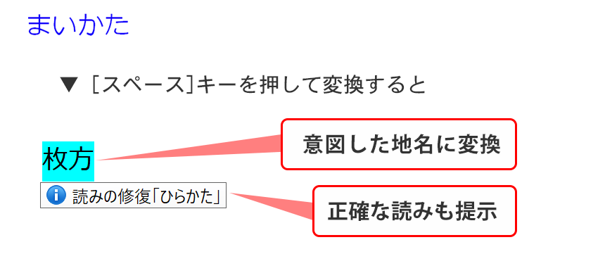 ●正確な読み方が分からなくてもOK「地名の入力支援」難読地名や初めて訪れた地域の駅名など、正確な読みがわからない場合は、見たままの読みを組み合わせて入力すると正確な地名に変換できます。