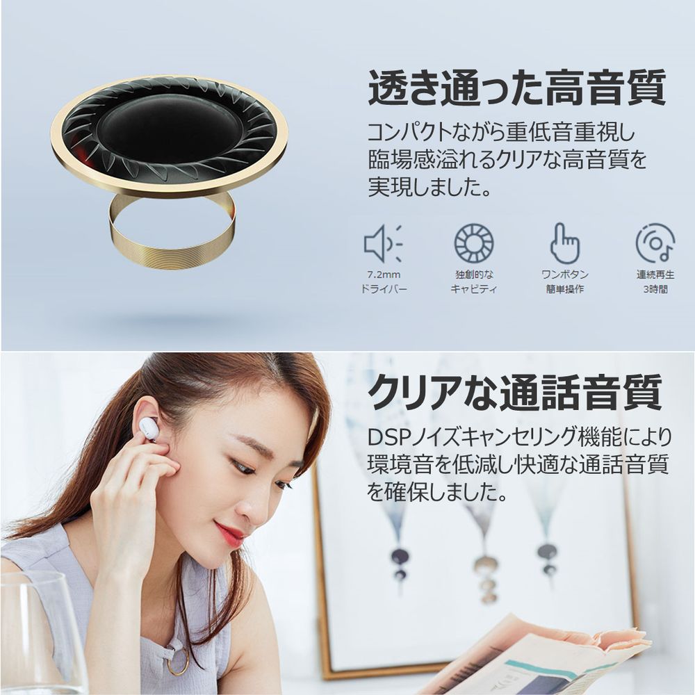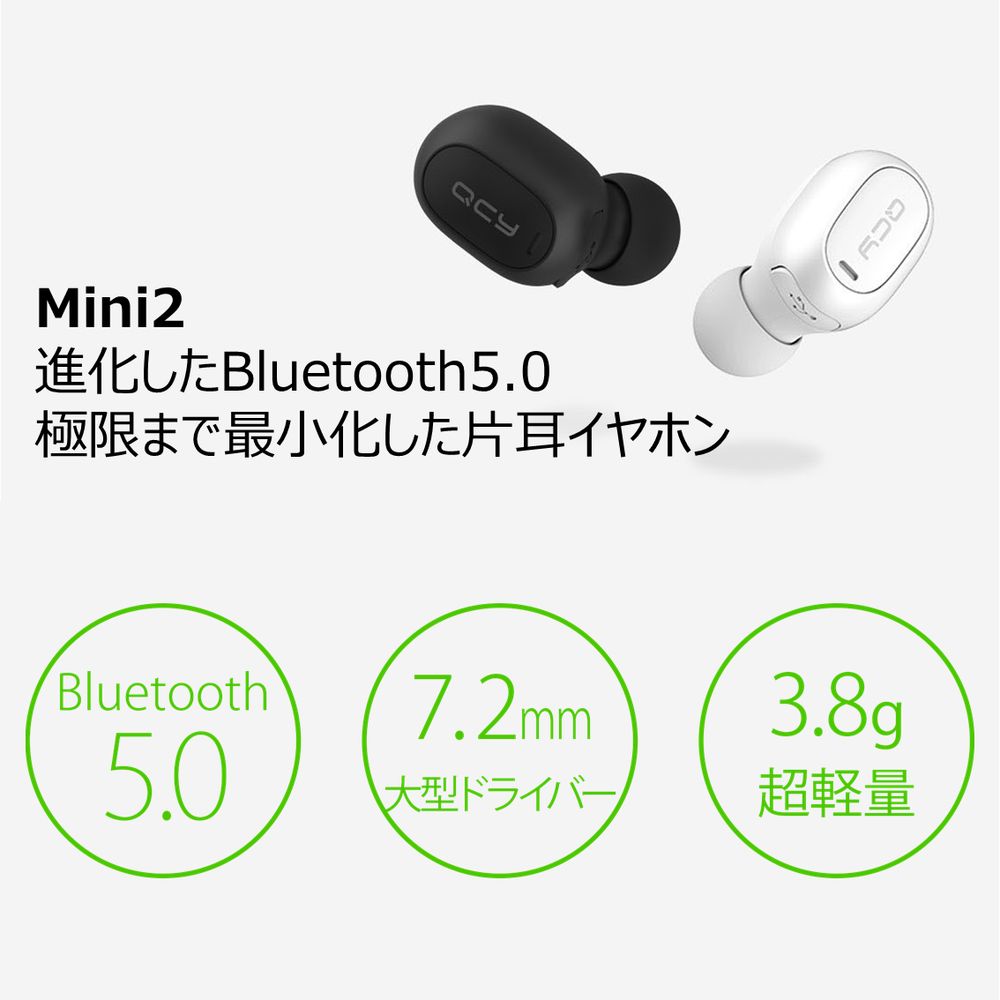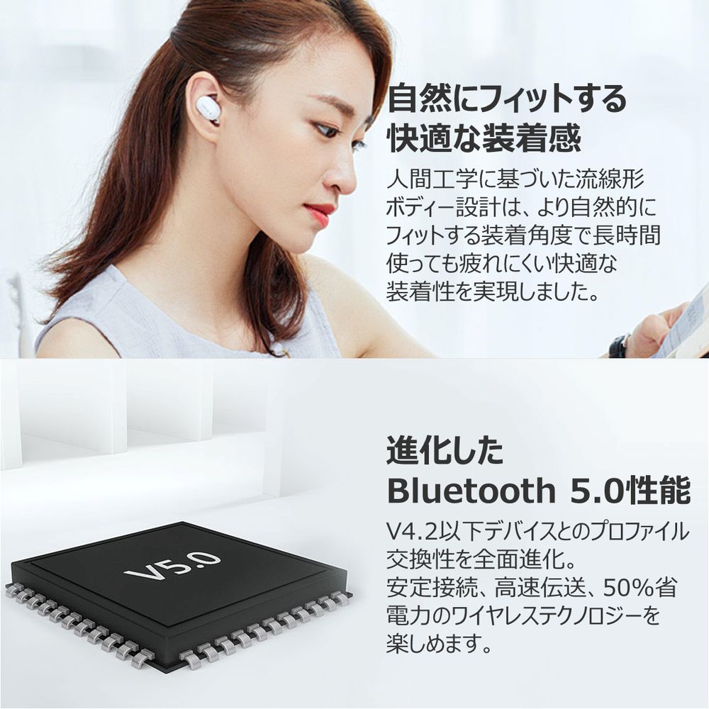 Bluetooth 5.0に進化した超軽量でコンパクトな片耳イヤホン、イヤホンらしいシンプルなデザインで耳の中に隠れるほどの3.8gコンパクトなボディー;ワンボタン操作でBluetooth初心者も楽々楽しめる; Bluetooth V5.0チップ採用し、V4.2以下デバイスとのプロファイル交換性アップし、ワイヤレス安定接続、伝送、省エネ性能を向上させ、遅延感のないモノラル高音質を実現;人間工学に基づいた装着角度は、脱落心配なく、より自然的にフィットし、長時間使っても疲れにくい快適な装着性を実現。