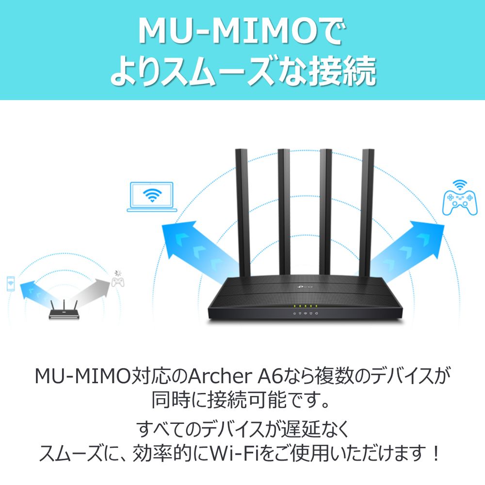 MU-MIMO対応のArcher A6なら複数のデバイスが同時に接続可能です。すべてのデバイスが遅延なくスムーズに、効率的にWi-Fiをご使用いただけます!