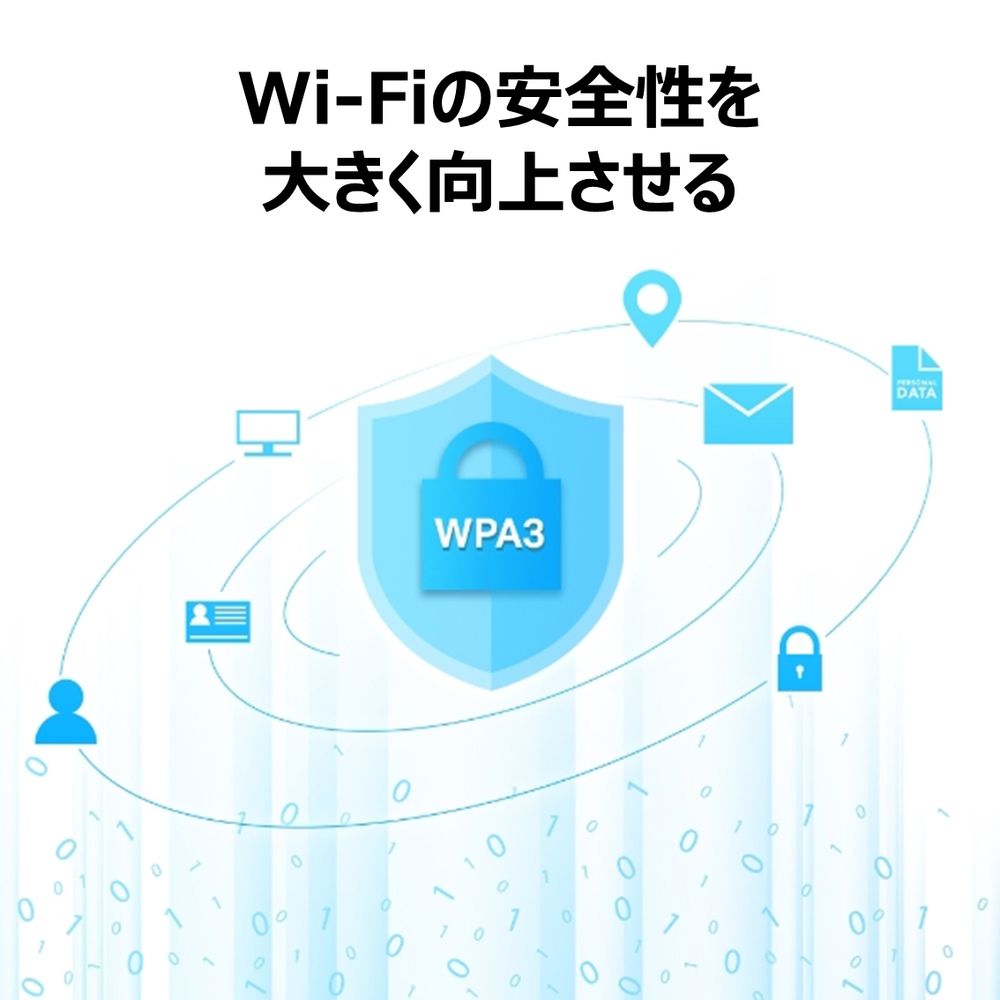 Wi-Fiの安全性を大きく向上させた最新のセキュリティ規格WPA3に対応しました。Wi-Fiパスワードの安全性を左右する強力な暗号化とブルートフォース攻撃に対する保護を組み合わせることで、ご自宅のWi-Fiをより強固なものとします。